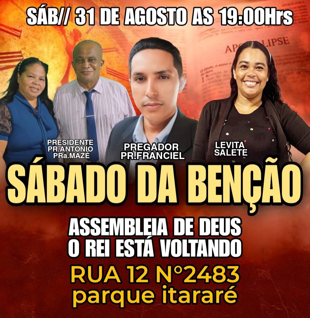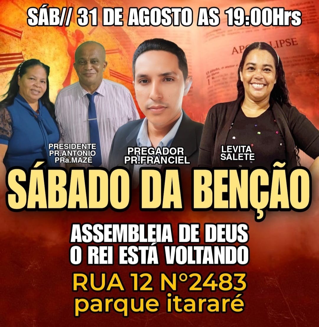 SABADO DA BENÇÃO SÁBADO DA BENÇÃO Expirado 25 Ago - 2024 · 15:38 > 31 Ago - 2024 · 23:00 TERSINA - PIAUÍ SABADO DA BENÇÃO (Foto: Reprodução)